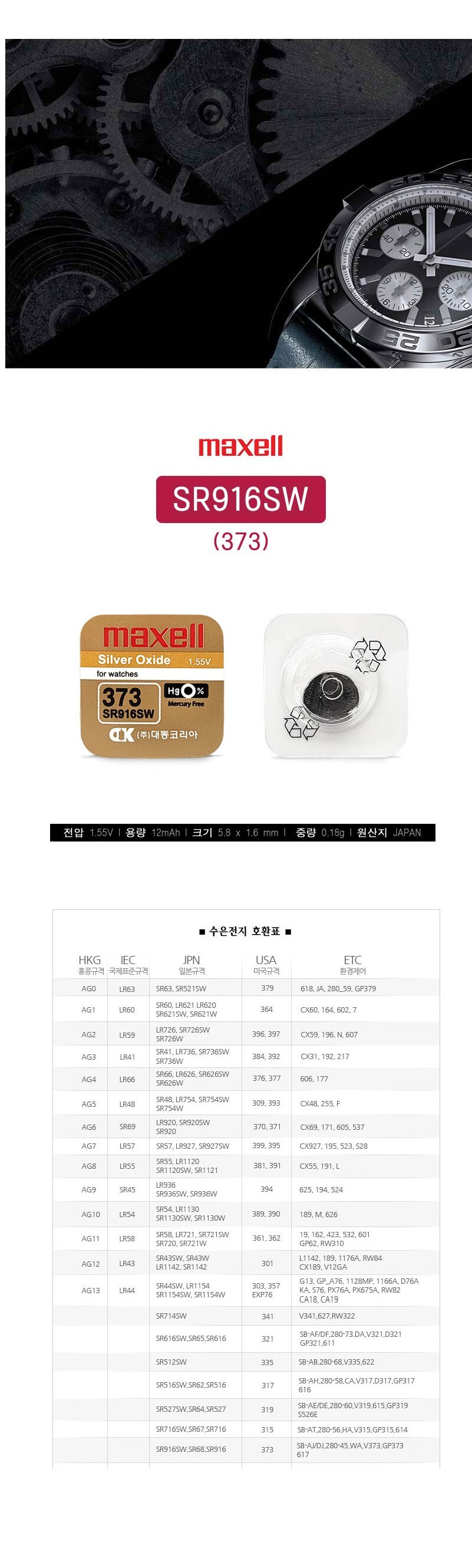 [시계건전지] 맥셀 MAXELL SR916SW 373 1.55V 26mAh